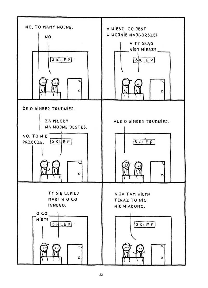 Autor postawił na minimalizm, konstruując kadry za pomocą prostej, archaicznej kreski. Ten zabieg rozbudza wyobraźnie czytelników, pozwalając na miejscu patyczkowych ludzików i czarno-białego krajobrazu umieszczać bliskie nam postacie i sytuacje. Polska z naszej głowy łączy się z komiksem, tworząc świat bardzo realny, wręcz sąsiadujący z naszymi życiowymi doświadczeniami.